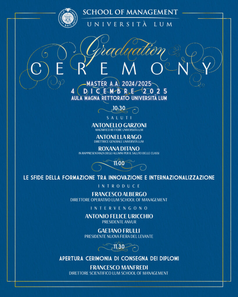 La School of Management dell’Università LUM celebrerà mercoledì 4 dicembre 2025, presso l’Aula Magna del Rettorato, la Graduation Ceremony dei Master A.A. 2024/2025.